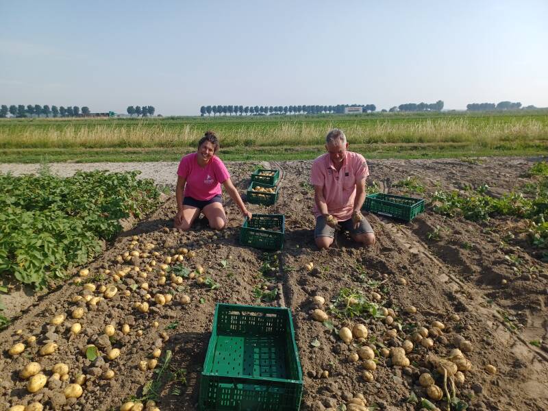 Nieuwe aardappelen worden met de hand geraapt omdat de schil nog niet afgehard is.
